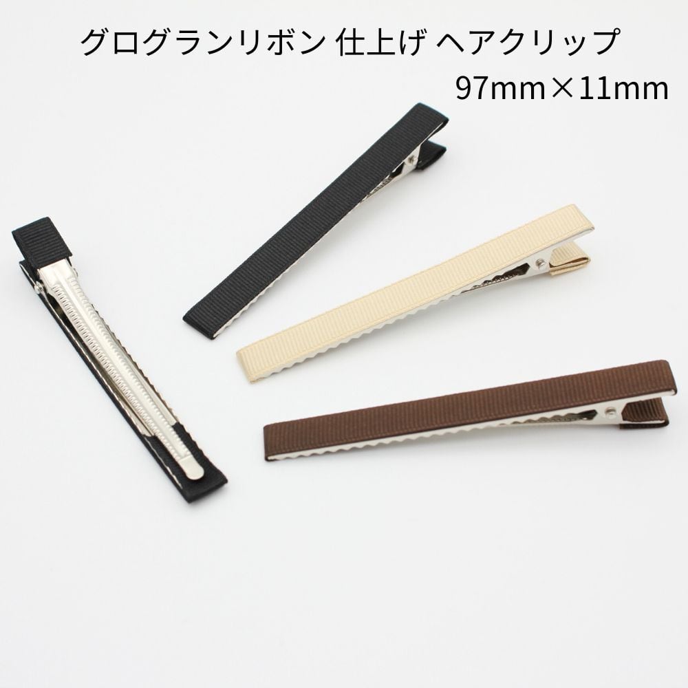 【同色2個】グログラン リボン 仕上げ 曲面 ヘアクリップ[ベース金具:銀色] [リボン:ブラック/ベージュ/ブラウン] [97mm×11mm] sgy-359-gr (やっとこピン クリップ ヘアピン 10cm アクセサリーパーツ パーツ 金具)